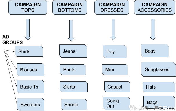 根据您的在线商店的部分和类别创建广告组。如果您销售女装,您将为以下各项创建一个广告系列:上衣,下装,连衣裙和配饰。然后,您需要将其分解成广告组。因此,在每个广告系列下,您将拥有多个广告组。