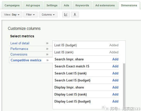 2. 点击竞争指标→添加展示次数份额列。