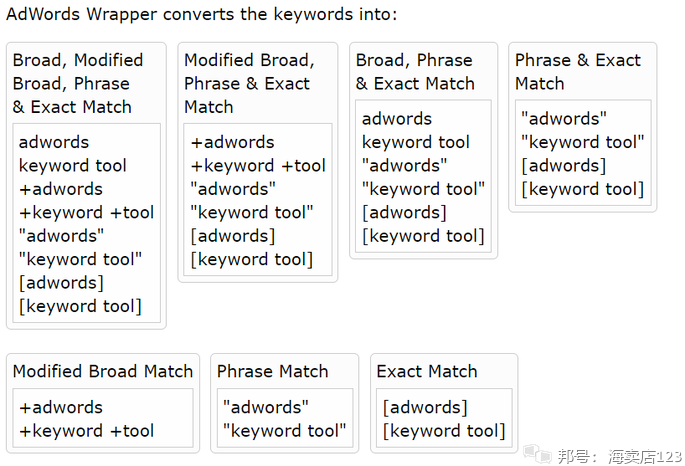 Mike的AdWords Wrapper将您的关键字包含在短语和完全匹配中,例如:“引号”(短语匹配)和[方括号](完全匹配)。这个易于使用的工具允许您排序关键字列表,并删除您有任何重复,通过输入完整的关键字列表,在这之后,包装分离成列表,你可以剪切和粘贴。