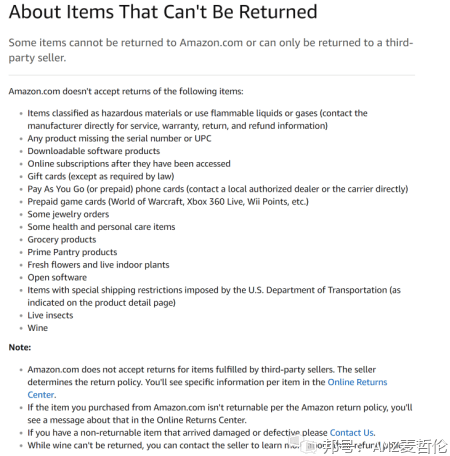 另外要注意,有些商品不能退货给亚马逊,或者只能退货给第三方卖家。下图(来自Amazon)详细解释了这一点: