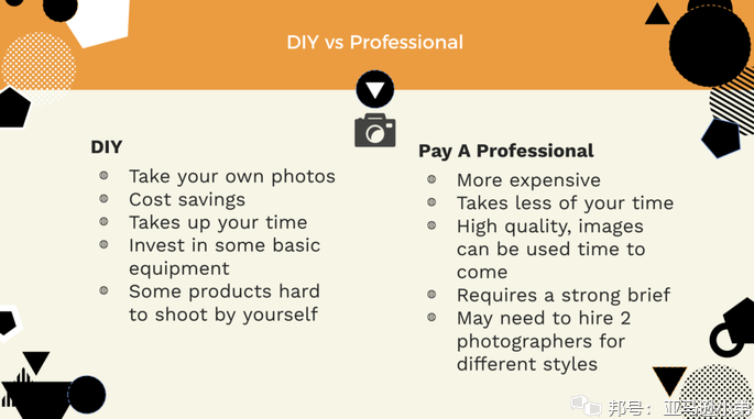 我们在会议#8,但在决定如何接近产品摄影时,有一些考虑因素。就像你现在已经收集到的,你可以自己做,也可以付钱给专业人士。以下是每一种方法的优缺点: