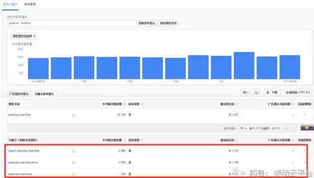 以我朋友的产品为例,以下是有关关键字packing machine的搜索量及趋势和相关关键字的推荐: