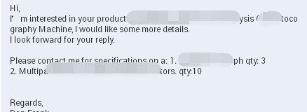 这是我一个真实的询盘,其中客户对产品的数量有十分明确的说明,后来证明这个客户是专门投标到一个公司的。大家可以从他数量的具体上体会到这个客户绝对是有实单的。