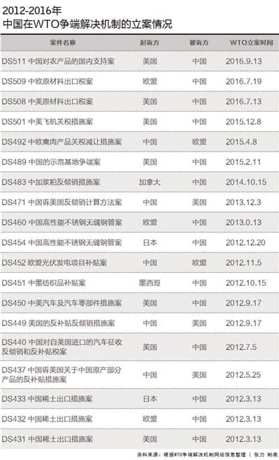 入世以来中国一直是保护主义打击的首要对象国。截至2016年10月,中国在WTO争端解决机制下共提起争端案件13起,被诉37起,提起和被诉争端案件共计50起。受2012年全球复杂经济形势的影响,中国在该年提起和被诉的争端案件均达到峰值,分别为3起和7起。
