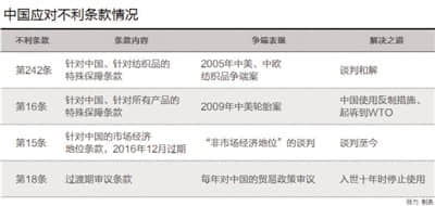 入世15年来,除WTO争端解决机制内的保护外,中国还要应对一些专门针对中国的贸易歧视。2001年中国加入WTO时签订了《中华人民共和国加入议定书》以及《中国加入工作组报告书》等多份法律文件,承诺中国除了需要遵守所有WTO成员均需遵守的多边贸易协定义务以外,还需要遵守诸多单独针对中国实行的“超WTO义务”,这些条款通常被视为入世协议中的不利条款。15年来,这些不利条款成为中国应对贸易保护主义的主要防御对象。