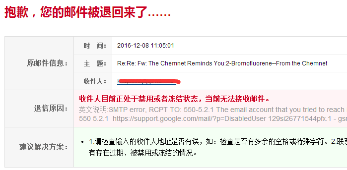 我们可以从这封退信上看出来目前收件人的邮箱出于禁用或者冻结状态,当前无法接收邮件。所以我真的是怀疑这个客户的真实性了。我们还是要小心点比较好。这也就要求我们每次收到客户的邮件的时候,尤其是新邮件的时候我们一定要判断好这个客户,也就需要我们自己要在网上多查一下关于这些客户的信息,以及和客户多了解一些信息之后我们再点开客户的链接,我们不要贸然的打开客户发给我们的连接。