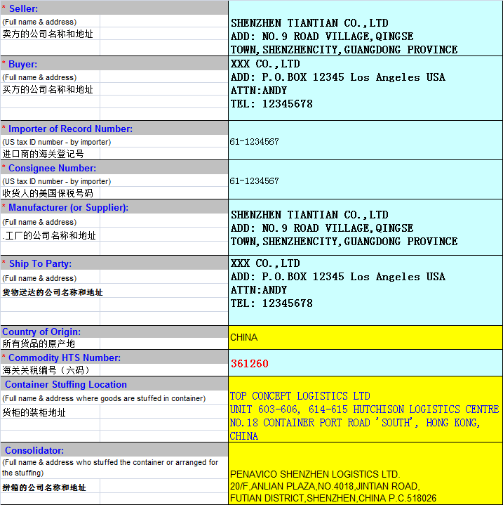 介绍完了新规的那么多项内容之后,我相信大家都还是一脸懵逼的。都说实践是最重要的,那就把一份模板放上来让大家参考一下,看过之后以后就知道需要怎么填写ISF申报表格内容。