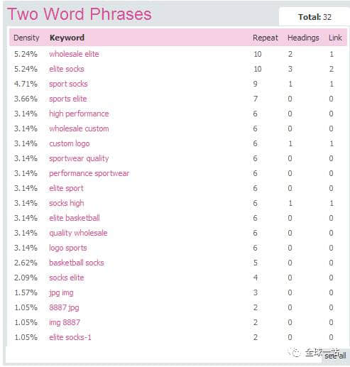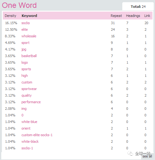 这些词除了wholesale elite socks是我们创建文案的时候设置的,其他的都是谷歌分词系统根据谷歌规则进行自己统计的。也就是说,上面的一个词的关键词[24个]和两个词的关键词[32个],都是可以为该页面带来流量的关键词,已经远远的超越了我们设置的1个关键词。