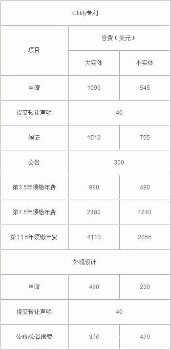 美国专利对于个人申请及小实体(员工人数少于500人)申请有费用减免的政策,在各个阶段所涉及到的主要官费如下: