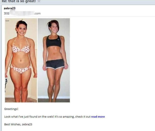 你或许看到的,就一张图片一句话,但是我看到了很多内容,使用图片的好处是直观,有说服力,而且看了图片就知道客户想介绍的是减肥产品。而且是对比图,对比图的内容就更多了,更加引人入胜,比我们的纯文字描述来得更有说服力。所以我在我写的书中也说到了,图片是很好的邮件内容之一,要善于把握,但不知道有多少人真正地这么去做。如果你还没有去做,这篇文章就是告诉你,你要尝试改变了。