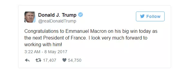 耿直Boy川普在Twitter狠认真地写道:"恭喜马克龙今天大胜,当选下任法国总统。我非常期待与他合作!"