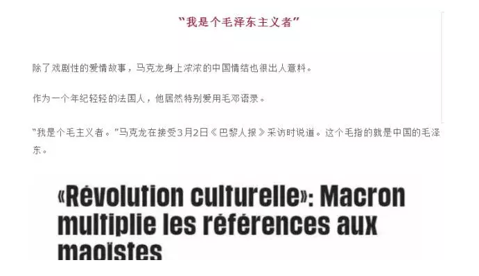 马克龙身上有浓浓的中国情结,特别爱用毛邓语录,在接受采访时,曾公开表示"我是个毛(泽东)主义者"。