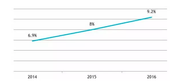 据法国回声报,法国2016年电商销售额达720亿欧元。2014-2016年,法国零售业中电商销售额比例不断攀升。
