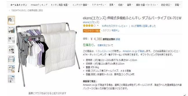 晾衣杆、衣架、晾衣夹,上周上升33%,参考ASIN:B00MTHU8VS、B00MTHU8VS、B0107E17C8 ,上图晾衣架,商品平均评分在4颗星,差评是2颗星。好评小编就不列出来了,差评主要表现在:组装困难,浪费时间,组合之间的接口、缝隙不圆滑;高度调节、平行展开等动作生涩费力,女性使用起来不是很方便。因此,新入局的卖家可以试着从以上买家的评价反馈中,改善自身产品表现,让消费者获得更佳的购物体验。