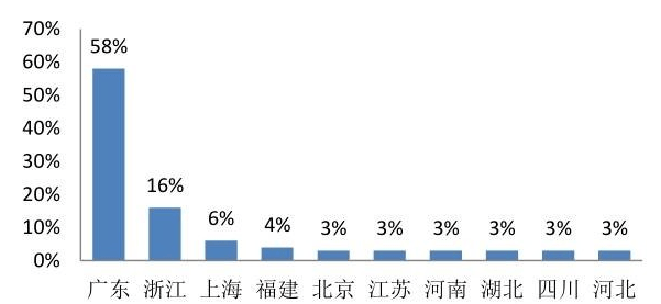 广东省在跨境电商规模指数中排名第一,超过半数卖家聚集在此,3C及服装类销量领先,主要得益于成熟的经济发展、良好的区位优势、丰富的外贸人才储备、便利的物流基础设施以及完备的制造业产业链; 长三角江浙区以服饰、鞋帽和家居类为销售领先,拥有发达的轻工业基础,产业集群效应表现明显; 福建以运动鞋服为主,拥有丰富的货源采购和出口优势。