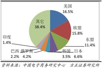 东盟、韩国、俄罗斯、印度等不断崛起的 新兴市场正成为跨境电商零售出口产业的新动力:俄罗斯、巴西等国家的本土电商企业并不发达,消费需求旺盛,中国制造的产品物美价廉,在这些国家的市场上优势巨大。