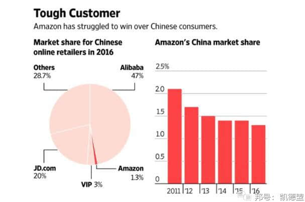 据Euromonitor的数据显示,2016年阿里巴巴以47%的份额位列中国电商市场第一,京东20%排名第二,唯品会(VIP)第三,份额3%。而亚马逊仅剩1.3%。