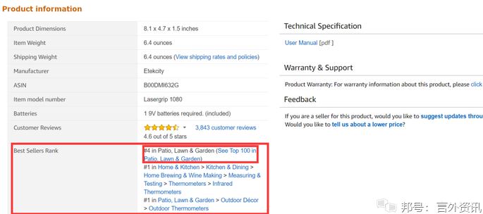 当我们在做选品分析时,打开任何一条Listing,在产品描述的下面,都会有一个类目Best Sellers Rank(BSR)排名栏,如下图: