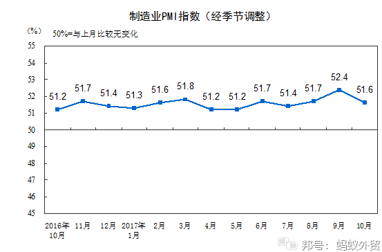 2017年10月份,中国制造业采购经理指数(PMI)为51.6%,比上月回落0.8个百分点,达到今年均值水平,制造业延续扩张的发展态势。