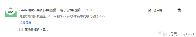第一个:它是谷歌浏览器的一个扩展程序,叫Gmail和收件箱郵件追蹤:電子郵件追蹤,如下图所示: