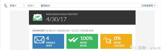 另外,这个工具还可以统计我们每天发了多少封邮件,打开率有多少,如果邮件中有链接,链接的点击率有多少。如下图所示: