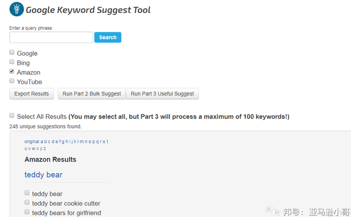 这个网站的关键词获取功能是可以免费使用的,这对于新买家来说应该是个好消息了。根据网站上给出的使用教程,卖家只需要将自己产品的核心词填入搜索框,然后就可以看到对应平台上搜索频率最高的词组了,对了,鉴于我们现在的期望是能在亚马逊平台上有比较好的效果,可以只勾选第三个亚马逊的方框就行了。事不宜迟,让我们试试看我们的teddy bear会有哪些高频搜索吧。